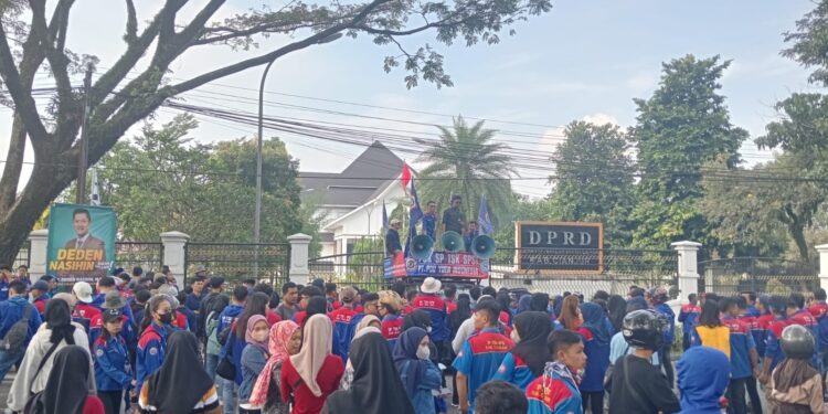 CIANJUR – Ratusan buruh menggelar aksi unjuk rasa di Gedung DPRD Kabupaten Cianjur, Kamis (14/6/2024). Mereka menyuarakan penolakan atas kebijakan pemerintah soal Tabungan Perumahan Rakyat (Tapera).