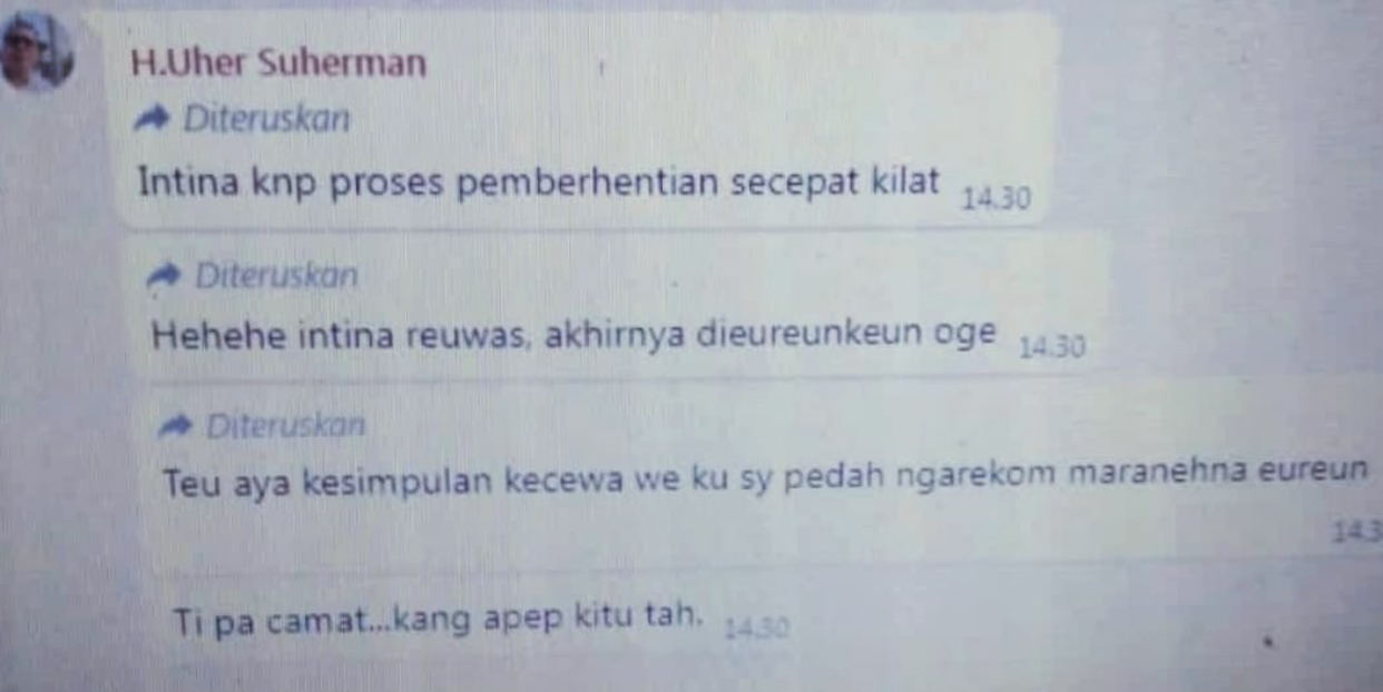 Dugaan itu terungkap setelah beredar chat aplikasi perpesanan yang dikirim Kepala Desa Uher Suherman di grup WhatsApp. Isi chat-nya secara garis besar menyebutkan pemberhentian lima perangkat desa merupakan andil kerjasama keduanya.