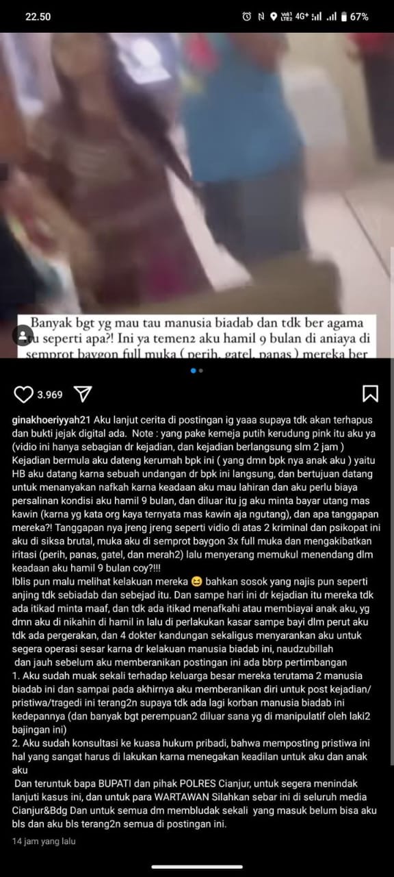 Diberitakan sebelumnya, ramai beredar sebuah video di media sosial yang diunggah sebuah akun Instagram dengan nama @ginakhoeriyyah21. G mengaku sebagai istri muda seorang politikus sekaligus pengusaha asal Cianjur berinisial HB. Akun tersebut mengaku menjadi korban dugaan penganiayaan yang dilakukan istri tua politikus Partai Demokrat.
