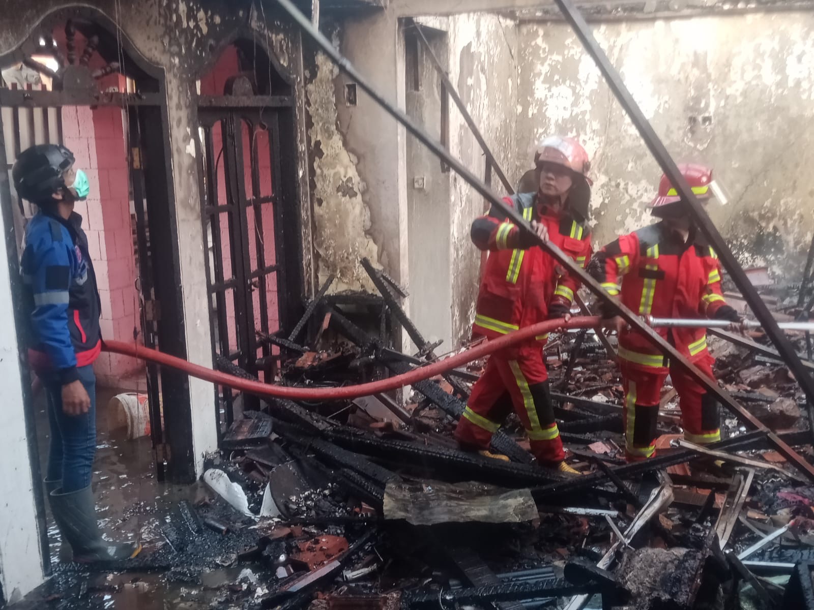 PEMADAMAN: Petugas pemadam kebakaran berjibaku memadamkan api yang membakar bangunan rumah merangkap gudang botol minuman plastik. (Dok. Istimewa)