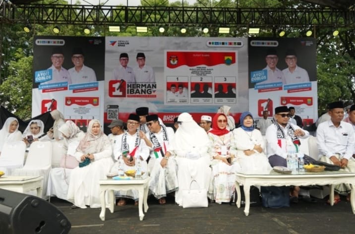 CIANJUR – Pasangan calon Bupati dan Wakil Bupati Cianjur Herman Suherman-Mohamad Solih Ibang menggelar kampanye akbar di Lapang Prawatasari, Sabtu, 23 November 2024. Kegiatan paslon nomor urut 1 itu diisi istighosah dengan melibatkan alim ulama serta dimeriahkan band religi Sabyan Gambus.