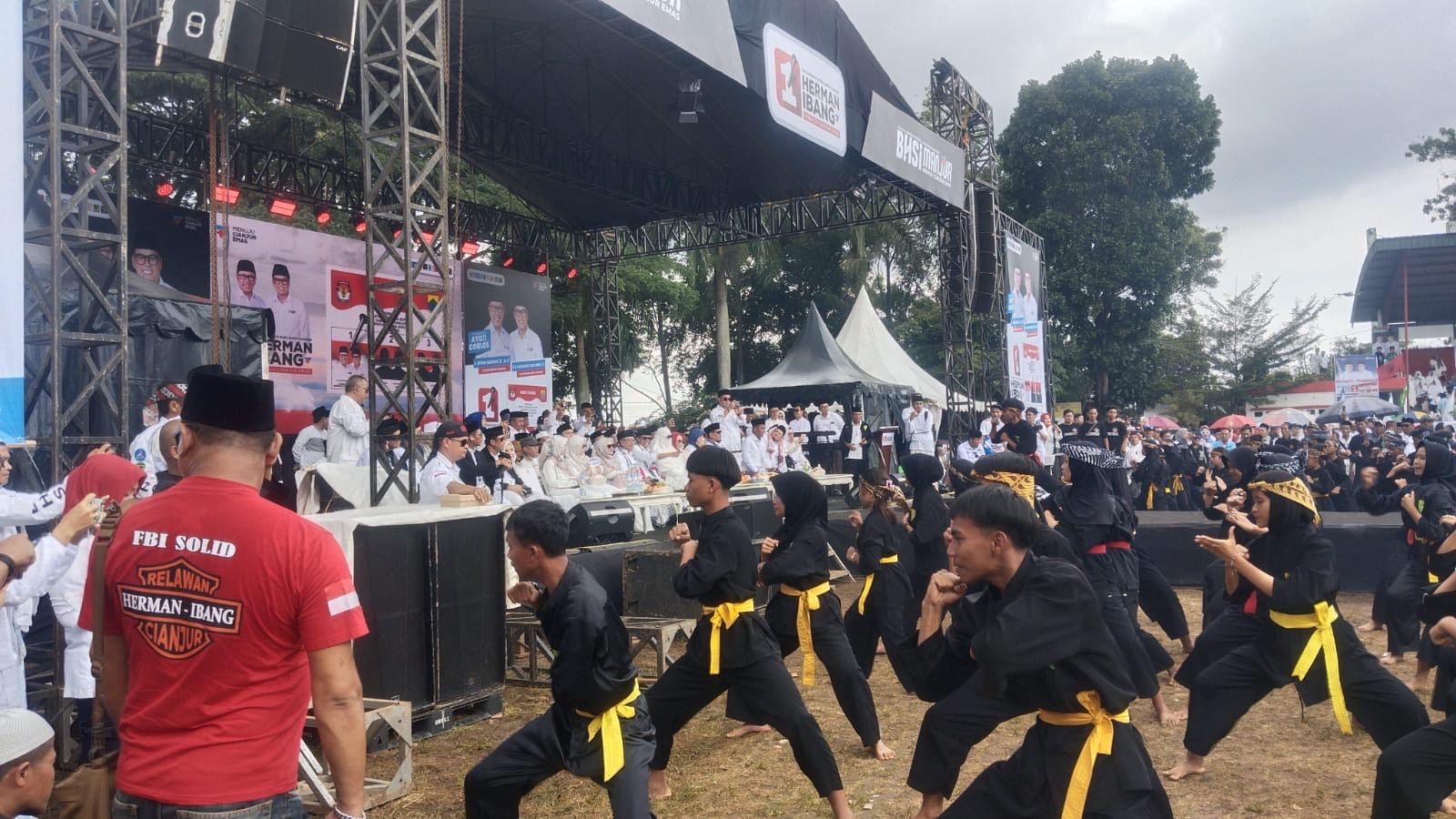 CIANJUR– Kampanye akbar pasangan calon Bupati dan Wakil Bupati Cianjur nomor urut 1, Herman Suherman dan Mohammad Solih Ibang, di Lapang Prawatasari, Sabtu, 23 November 2024, dimeriahkan penampilan tiga pilar budaya khas Kabupaten Cianjur. Tiga pilar budaya itu yakni Ngaos, Mamaos, dan Maenpo.