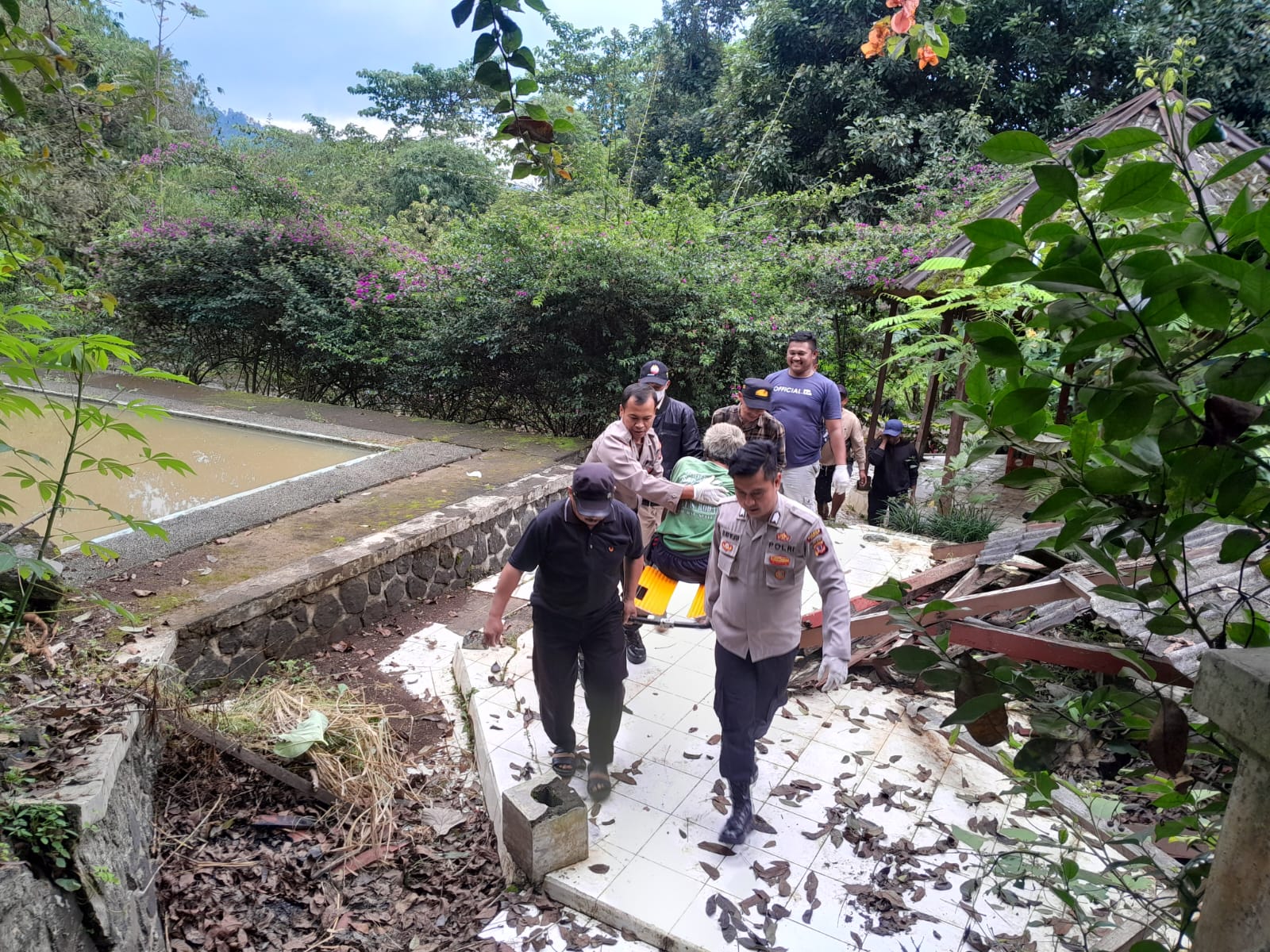CIANJUR – Anggota Polsek Cugenang Polres Cianjur mengevakuasi seorang lansia yang merupakan tunawisma di bekas kolam renang Tapal Kuda, Sabtu, 25 Januari 2025. Lansia tanpa identitas itu kemudian diserahkan ke Dinas Sosial Kabupaten Cianjur.