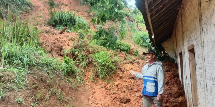 Cianjur – Satu rumah di Kampung Cimanggu, Desa Cibanggala, Kecamatan Campakamulya tertimpa tanah longsor dari tebing setinggi 7 meter, Rabu, (03/01/2024).
