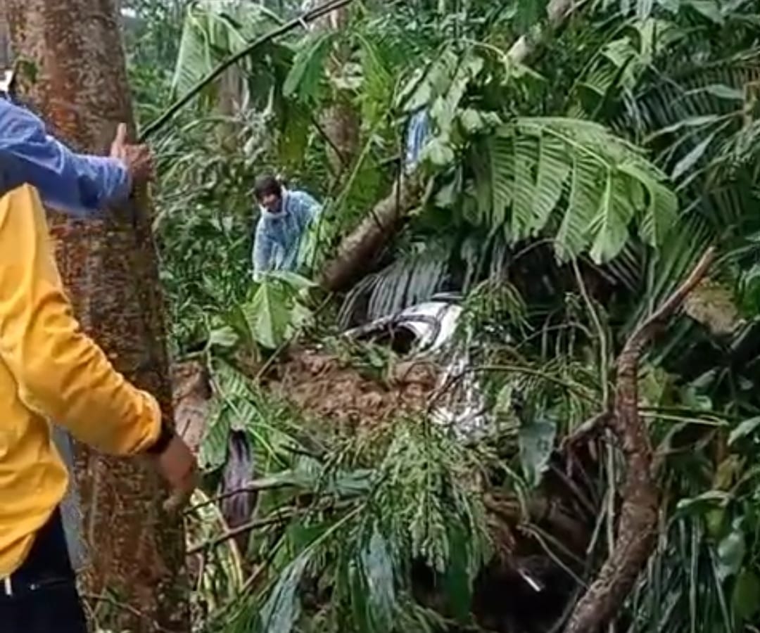 Namun, tiba-tiba tanah dan pepohonan pada tebing mengalami longsor. Materialnya kemudian menyeret mobil itu hingga terbawa ke tepi jurang.