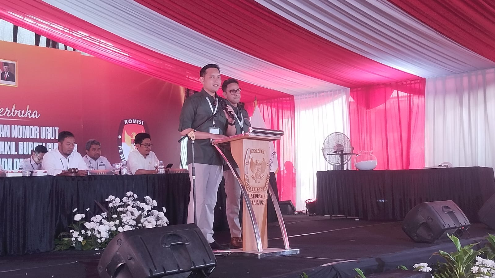 CIANJUR – Pasangan calon Bupati dan Wakil Bupati Cianjur Muhammad Wahyu-Ramzy Geys Thebe mendapatkan nomor urut 2 saat dilakukan pengundian di kantor KPU Kabupaten Cianjur, Senin, 23 September 2024. Mereka pun menyambut suka cita penetapan nomor urut tersebut.