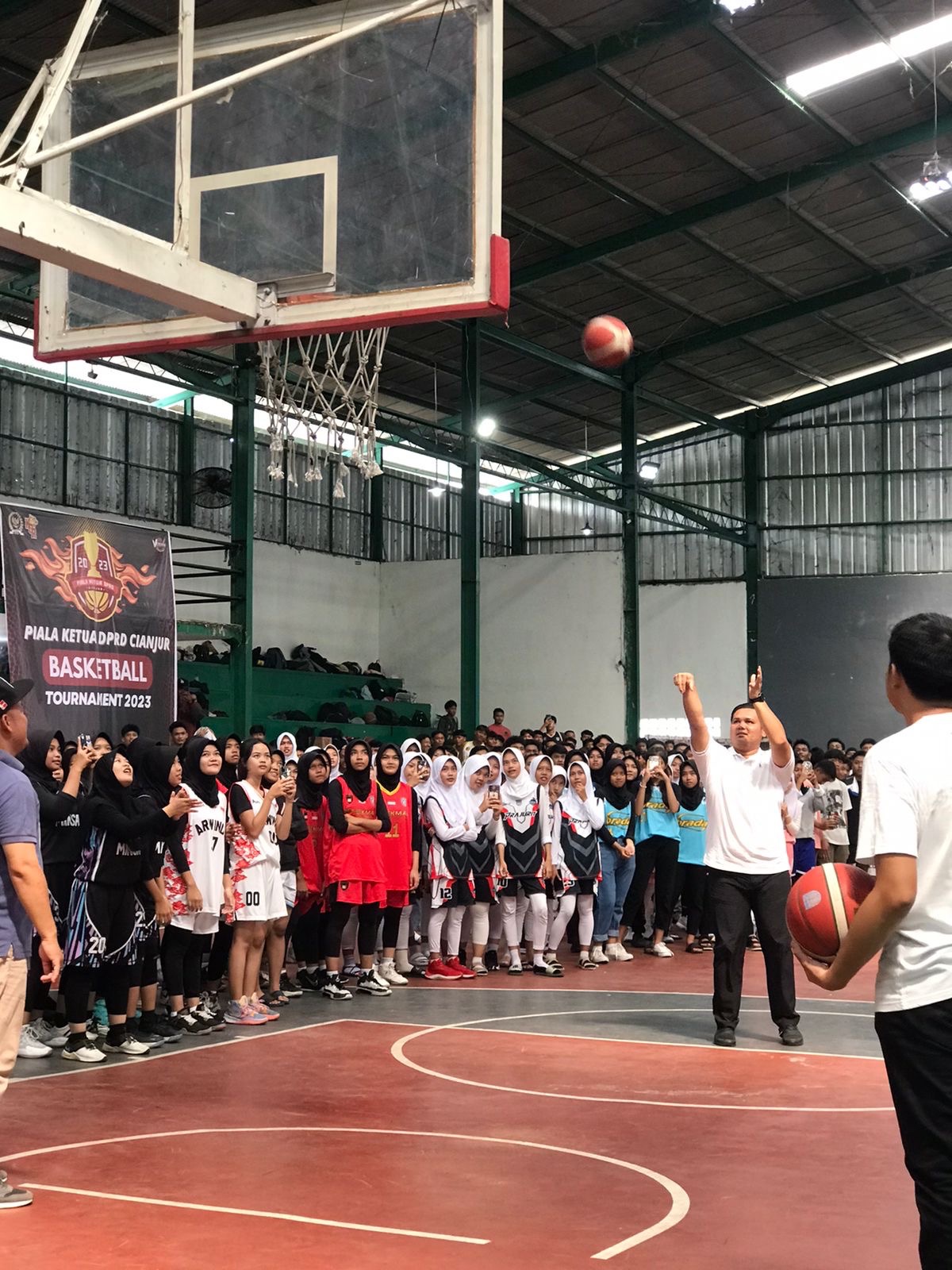 Cianjur– Turnamen Basketball Piala Ketua DPRD Cianjur, Ganjar Ramadhan resmi dibuka di Gedung Basket Cianjur Sport Centre (CSC) Rawabango, Jalan Raya Bandung Karangtengah, ditandai dengan melempar bola basket, Sabtu, (09/12/2023).