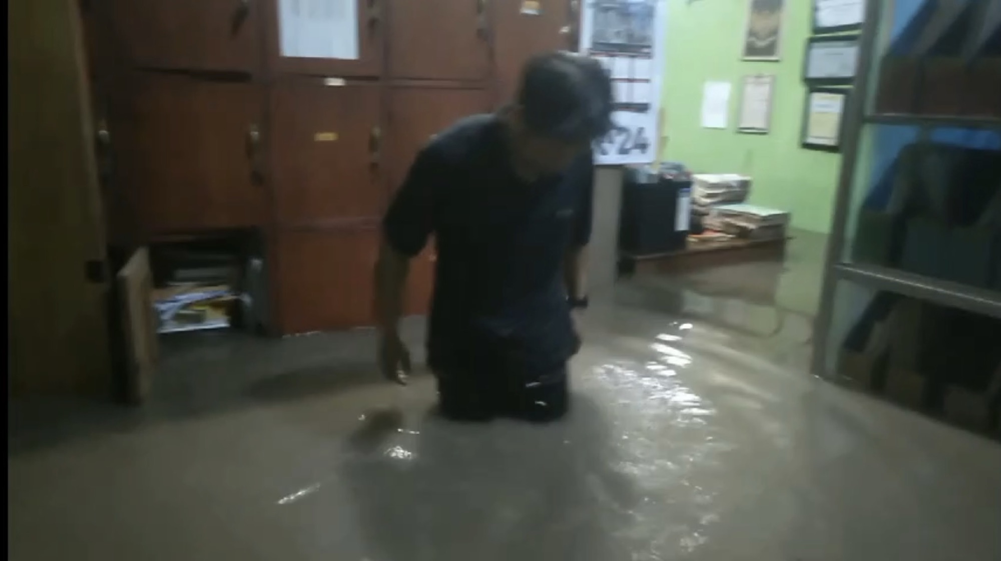 Tampak air memenuhi ruang kelas dan merendam meja dan kursi. Kedalaman air pun hingga pinggang orang dewasa.