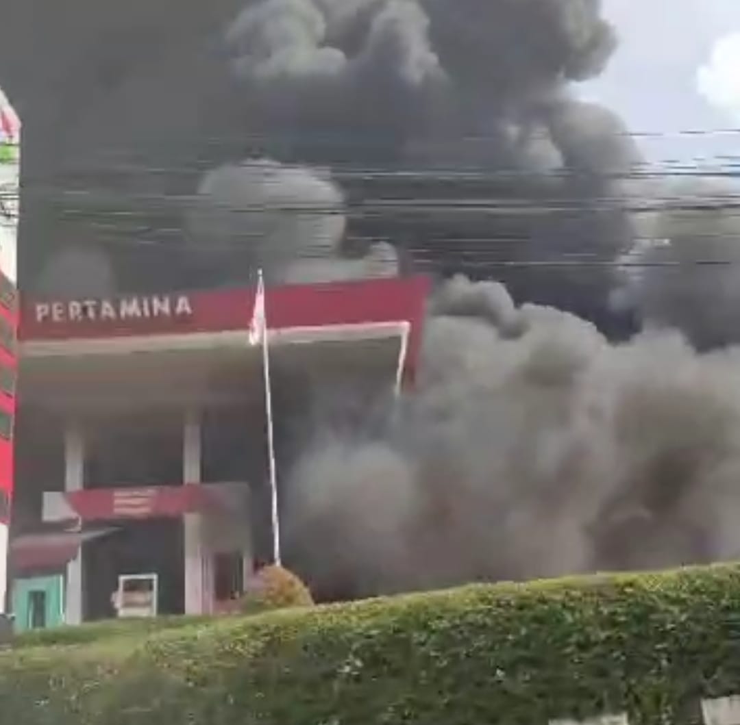 Api dengan cepat merembet membakar yang ada di sekitar SPBU. Kepulan asapnya terlihat pekat membumbung tinggi.