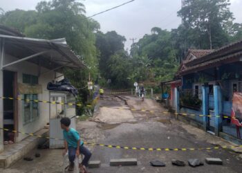 Cianjur - Sasak gembreng di Kampung Pasir Laja, Desa Babakankaret, Kecamatan Cianjur, ambruk akibat longsor, Senin (8/1/2024). Jembatan darurat dengan ...