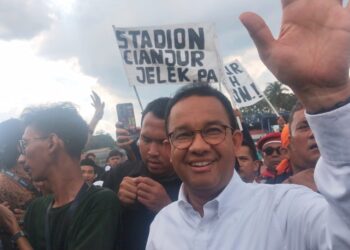 Cianjur - Calon Presiden (Capres) Anies Baswedan disambut riak puluhan suporter bola saat turun dari helikopter di Stadion Badak Putih, ...