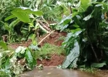 Cianjur - Tebing setinggi 5 meter ambrol sehingga memutus akses jalan Kampung Balangantrang Desa Kemang Kecamatan Bojongpicung dengan Desa Cihea ...