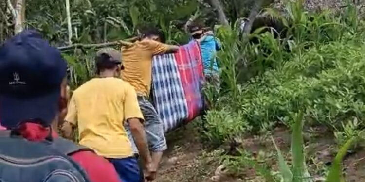 Anggota keluarganya secara bergantian memikul tandu menyusuri jalan setapak membelah hutan belantara hingga akhirnya tiba ke jalan utama.