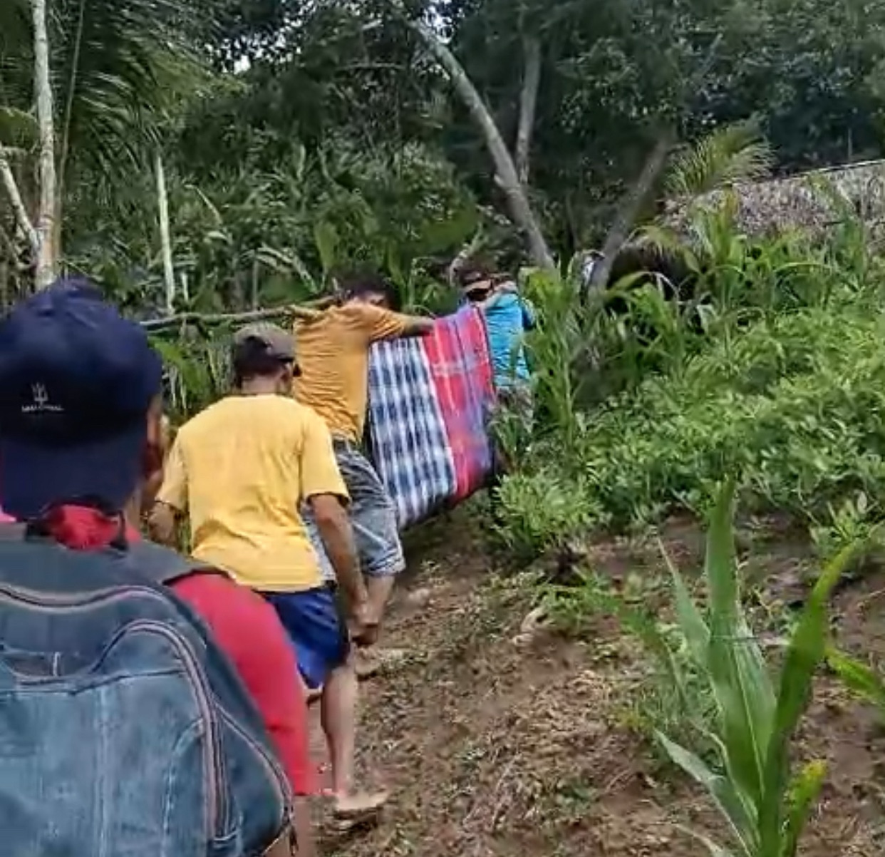 Anggota keluarganya secara bergantian memikul tandu menyusuri jalan setapak membelah hutan belantara hingga akhirnya tiba ke jalan utama.