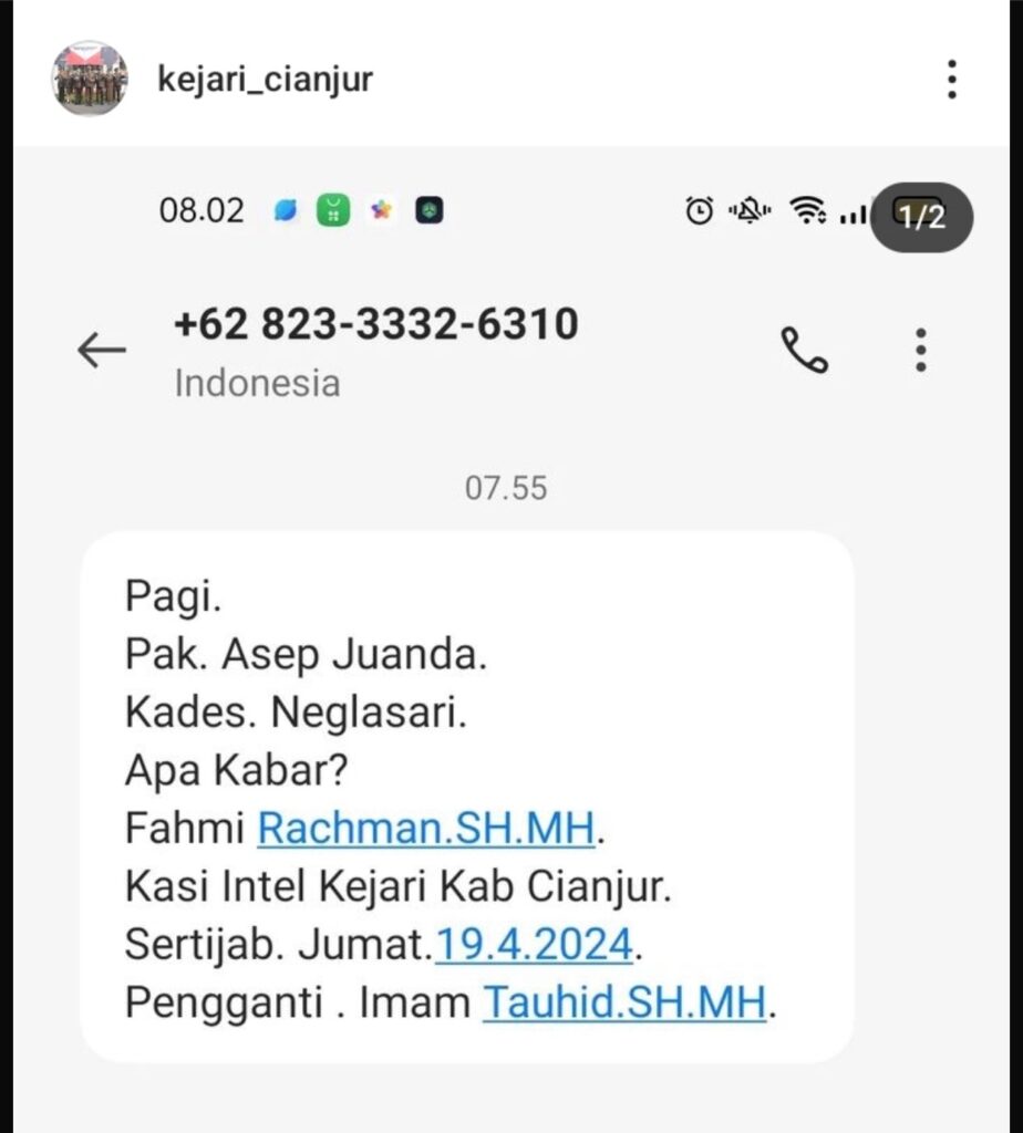 Cianjur – Aksi catut nama melalui pesan singkat dialami Kepala Seksi Intelijen Kejaksaan Negeri Cianjur Fahmi Rachman.