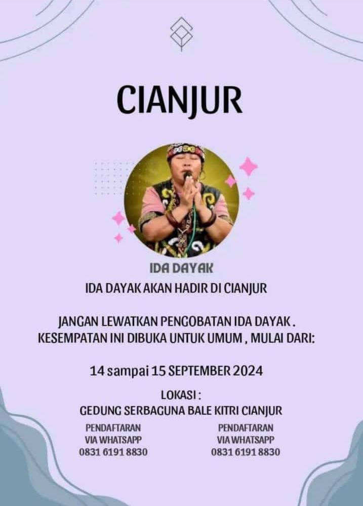 CIANJUR – Beredar selebaran bakal adanya pengobatan Ida Dayak di Kabupaten Cianjur. Lokasinya dilaksanakan di Gedung Serbaguna Bale Kitri pada 14-15 September 2024.